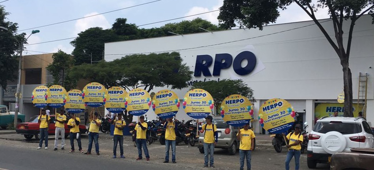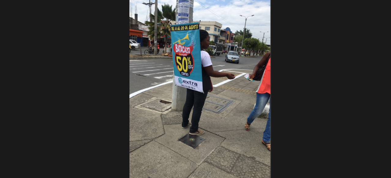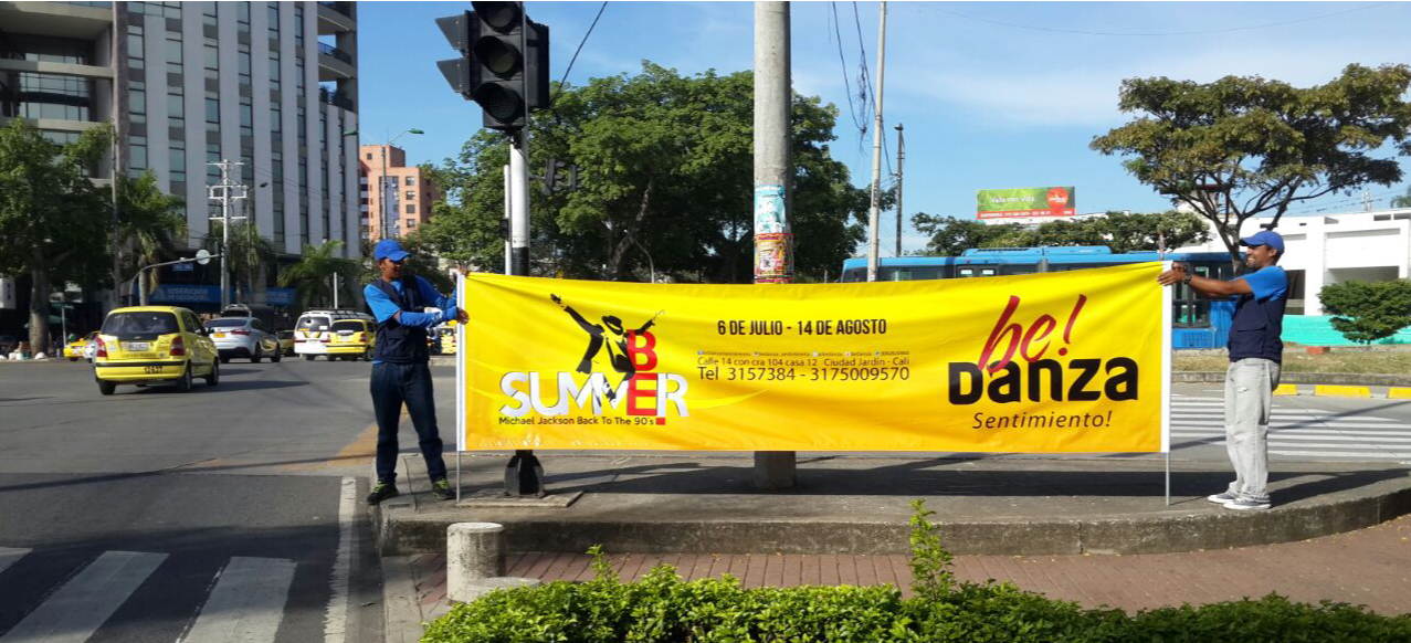 Son Vallas en diferentes tamaños que sostienen una o mas personas poniendola a la vista de transeuntes o vehículos en lugares estrategicos.